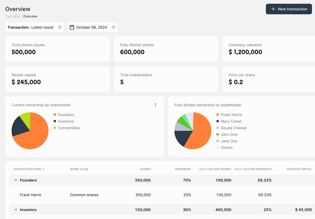 Keep your ownership structure clear. Track shareholders, transactions, and ownership changes - and share a clear picture with your investors.
